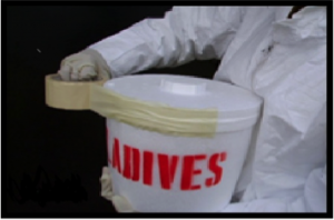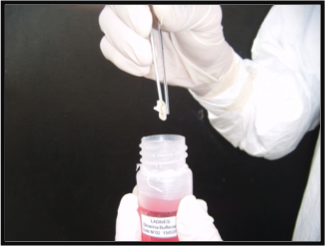 1. Coloque suficiente muestra (1 g. aprox.) dentro del envase plástico que recibe del LADIVES, con glicerina tamponada. En caso de existir líquido vesicular se colecta con una jeringuilla estéril cuyo extremo se ha de sellar con calor.